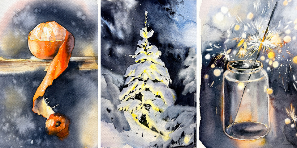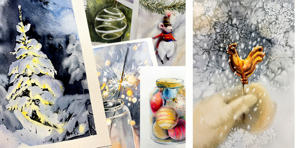 Мы погрузимся в атмосферу праздника благодаря акварельной магии: будем на бумаге включать лампочки и зажигать огни, рисовать стекло и блёстки, пушистую шерсть и уютно падающий снег.