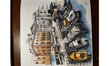 На последнем уроке курса вы будете рисовать полноценный городской сюжет, пользоваться активно знаниями перспективы и всех других техник, полученных на курсе.