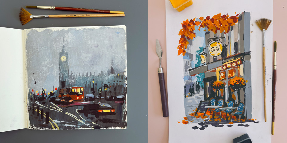 Сейчас я — художник в мультипликационной студии RIKI (в полнометражном мультфильме про Смешариков). Я люблю работать над цветом, светом и атмосферой в мультфильмах, и это же меня очень вдохновляет в скетчинге гуашью.