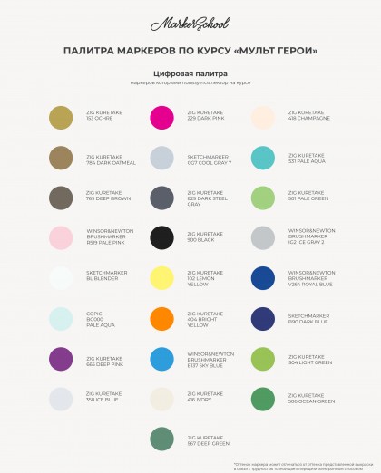 На всех 5-ти уроках курса используется небольшая палитра спиртовых маркеров.