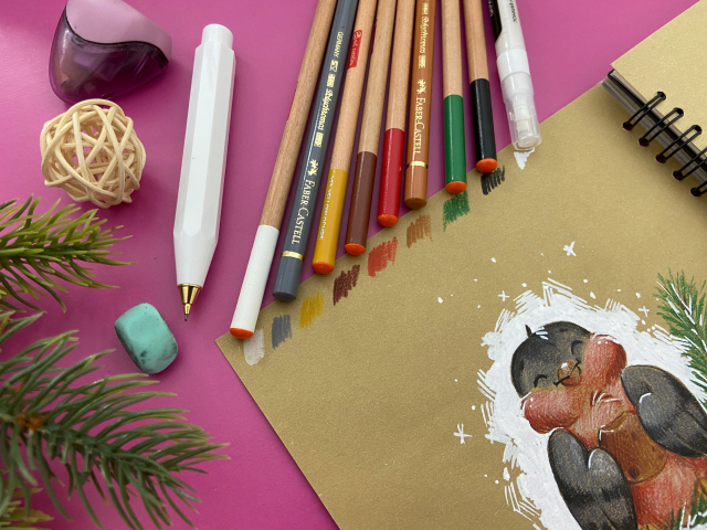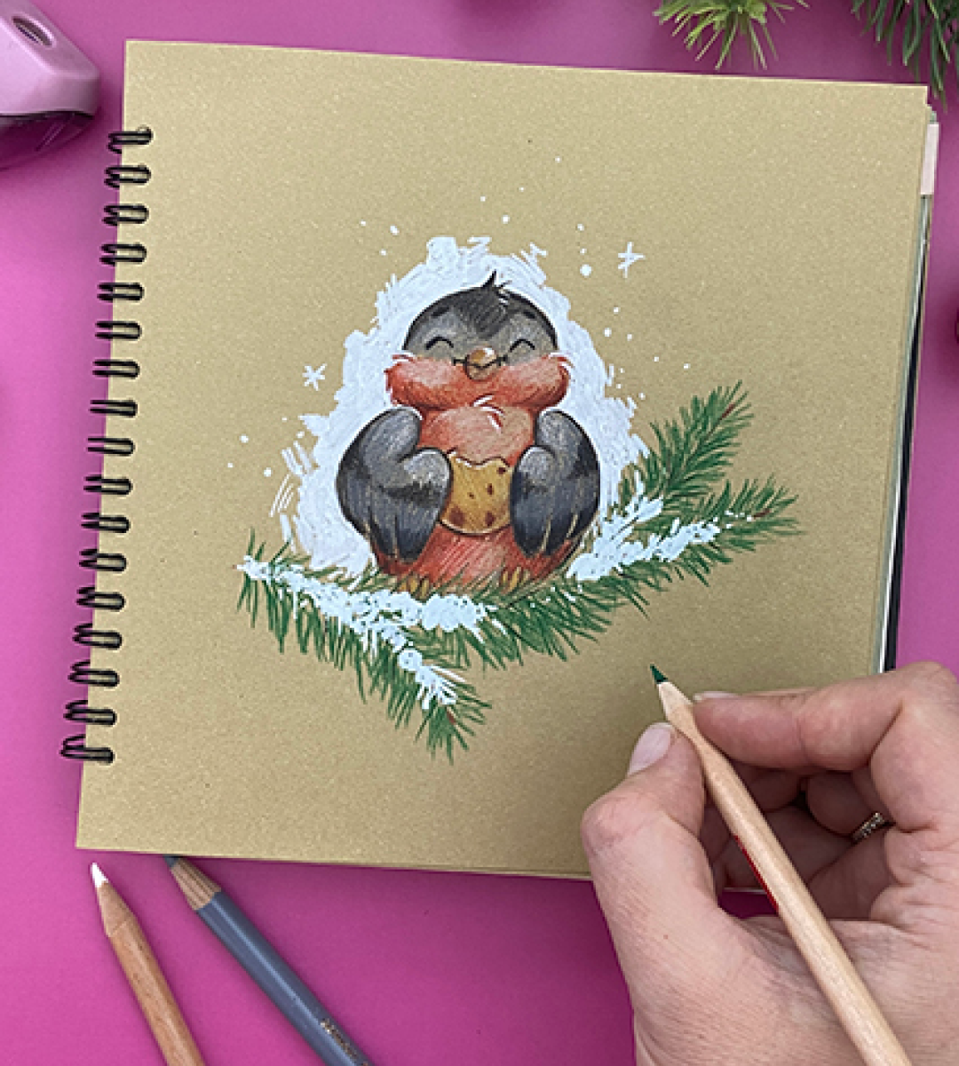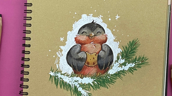 В этом уроке рисуем снегиря и исследуем, как работает крафтовая бумага вместо привычной белой основы. Разберём построение формы, аккуратное наслаивание цветных карандашей и работу с тёплым фоном. Покажем, как белый маркер или краска добавляют свет и объём.