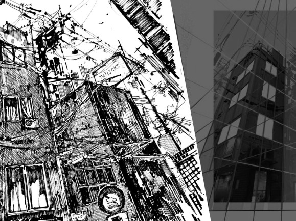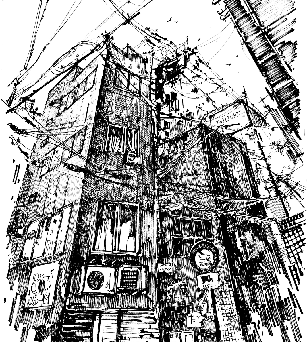 На мастер-классе нарисуем сюжет с тёмным японским городом в сложной трёхточечной перспективе — и всю эту красоту выполним в чёрно-белой графике да ещё и на формате А3