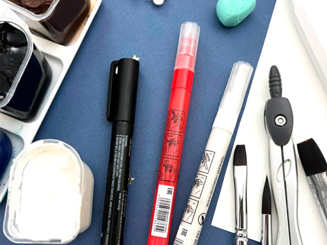 Для урока нам понадобятся: бумага, простой карандаш, ластик, циркуль, гуашь, кисти, черный и красный акриловые маркеры по желанию.