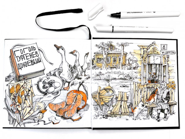 У меня родилось две работы в разных скетчбуках формата А5. Один — с линером и акварелью, другой — большой разворот с файнпенами, цветными карандашами".