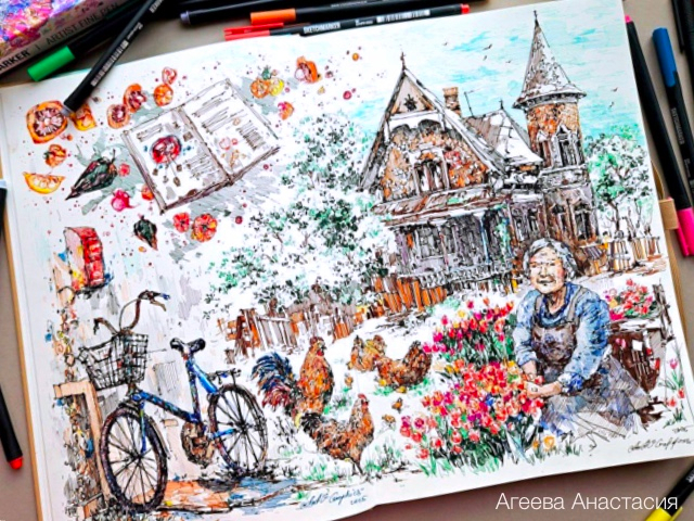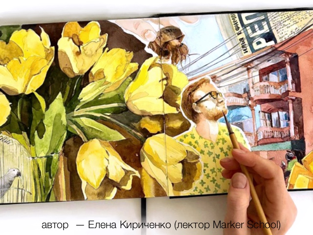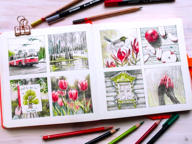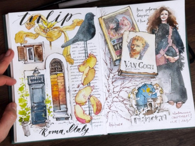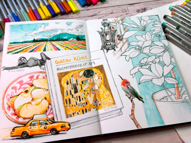 Я новичок в скетчинге, хотя наблюдаю за скетчерами регулярно. Всегда хотелось самой так же уметь компоновать изображения на разворотах скетчбуков!