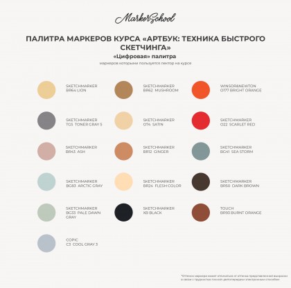 Вы можете самостоятельно подобрать необходимые материалы, независимо от их марки. Для этого смотрите справа блок картинок в котором мы показываем как реальные "живые оттенки", так и цифровые палитры оттенков которые нужны для прохождения курса.