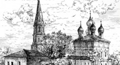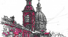 Создаём общий силуэт рисунка, намечаем главные архитектурные объекты и не спеша переходим к рисованию переднего плана.