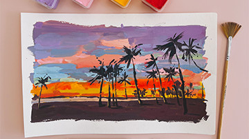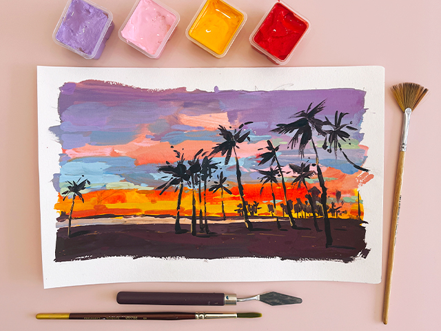 Делаем схематичные зарисовки с разными градиентами неба и красочный вечерний пейзаж с пальмами.