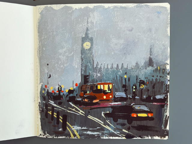 Делаем зарисовку городского пейзажа с признаками тумана или дождя.