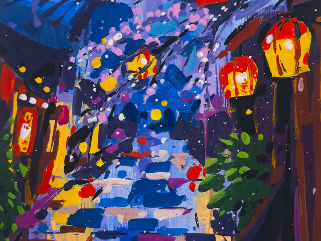 Лекция на тему работы контрастного пятна: акцента в ночной атмосфере скетча (луна, фонари и прочие источники освещения).