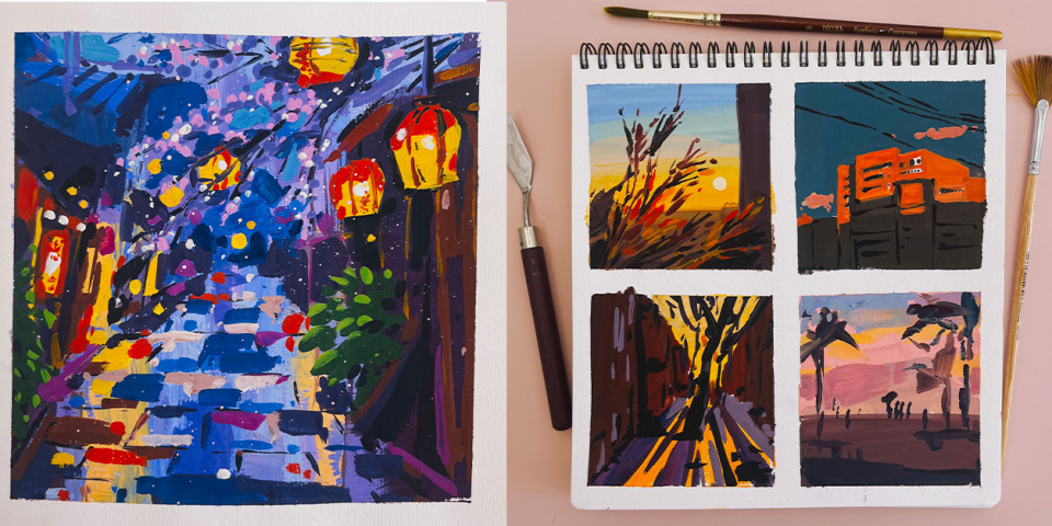 Сейчас я — художник в мультипликационной студии RIKI (в полнометражном мультфильме про Смешариков). Я люблю работать над цветом, светом и атмосферой в мультфильмах, и это же меня очень вдохновляет в скетчинге гуашью.