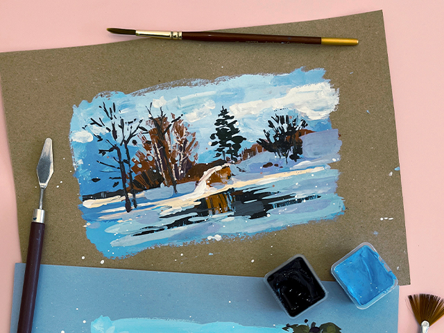 Учимся подбирать цвет для снега, не ограничиваясь белилами, и работать с тонированной бумагой.