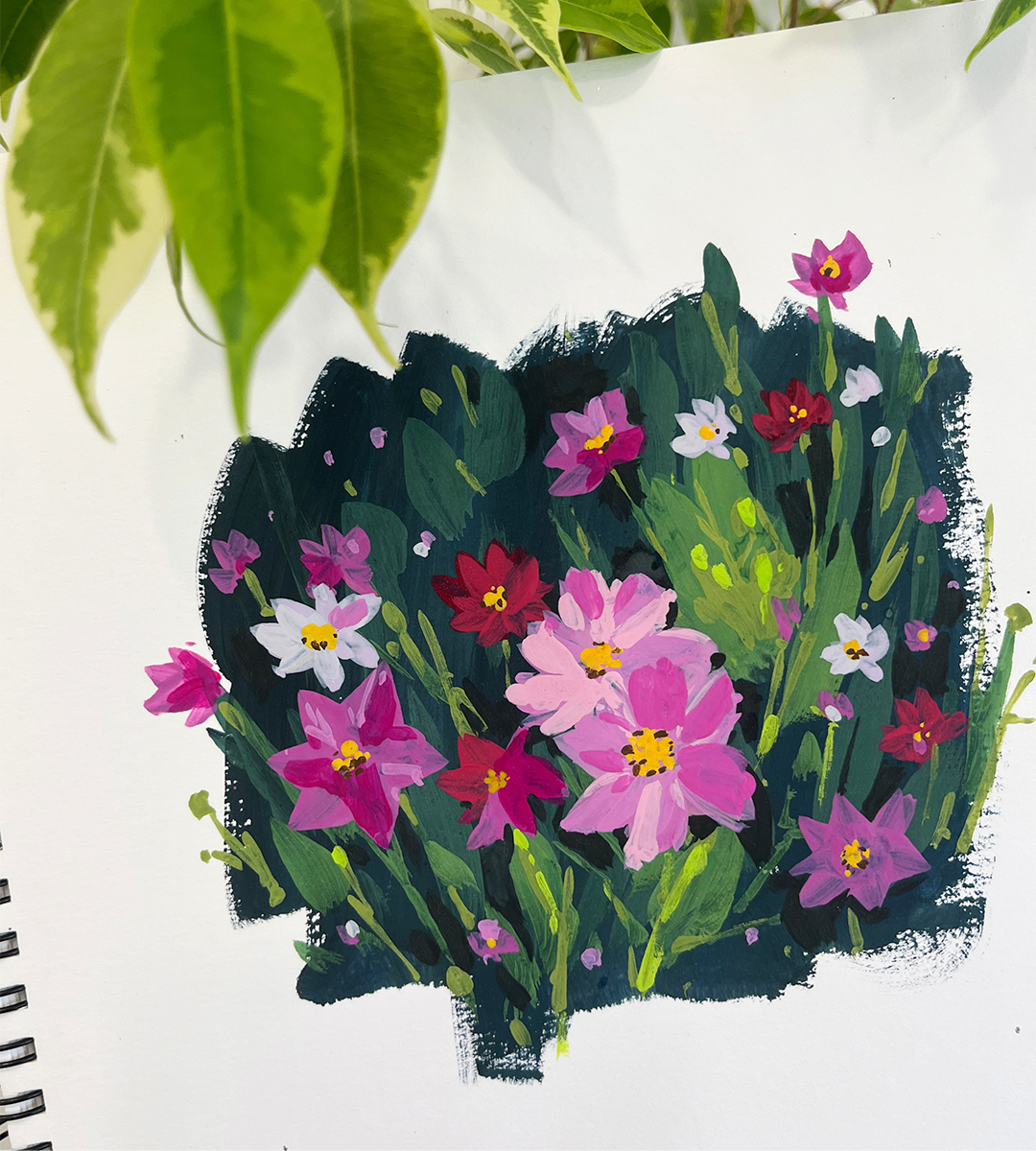 Учимся правилам изображения растений и как делать их зарисовки быстро и эффектно, используя базовую палитру гуаши.
