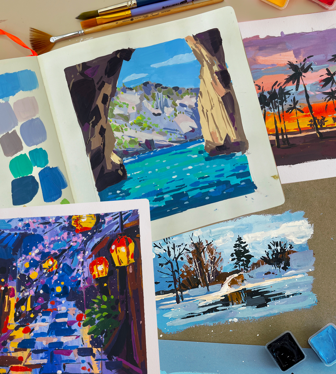 Специально для тех, кто хочет освоить гуашь, насладиться сочностью цвета и получить удовольствие от рисования ярких атмосферных скетчей.