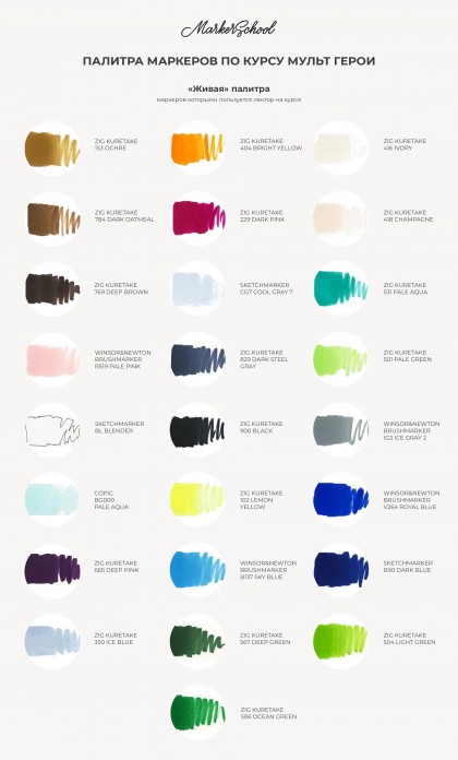 На всех 5-ти уроках курса используется небольшая палитра спиртовых маркеров.