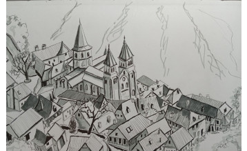 Третьим уроков в цикле Романика мы будем рисовать целую романскую деревню Конк во Франции с собором и каскадом крыш. К теме исторической, мы подключим так же еще важную художественную задачу для изучения на практике - основа архитектурного скетча в подаче - это конечно, графика.