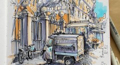 Обыденная жизнь города: с его дорожными знаками, машинами, людьми и магазинами - тоже может прекрасно уживаться в архитектурных скетчах, обогащать рисунок и оживлять сюжет.