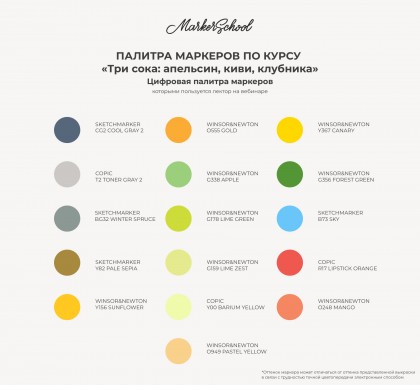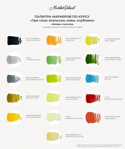 Еще раз хотим уточнить - что вы можете использовать абсолютно любые марки спиртовых маркеров. Наши преподаватели используют в своих уроках разные бренды: COPIC, SKETCHMARKER, TOUCH, ZIG KURETAKE, PRISMACOLOR, WINSOR&NEWTON. Мы учим скетчингу не привязываясь к бренду.