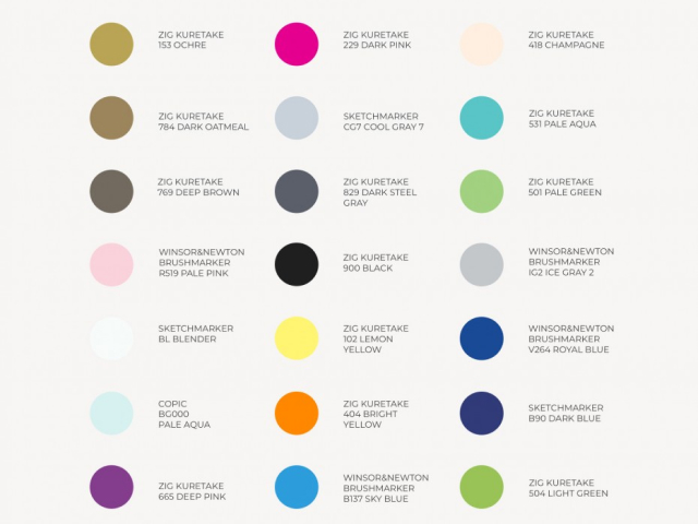 Наши преподаватели используют в своих уроках разные бренды: COPIC, SKETCHMARKER, TOUCH, ZIG KURETAKE, PRISMACOLOR, WINSOR&NEWTON. Мы учим скетчингу не привязываясь к бренду.