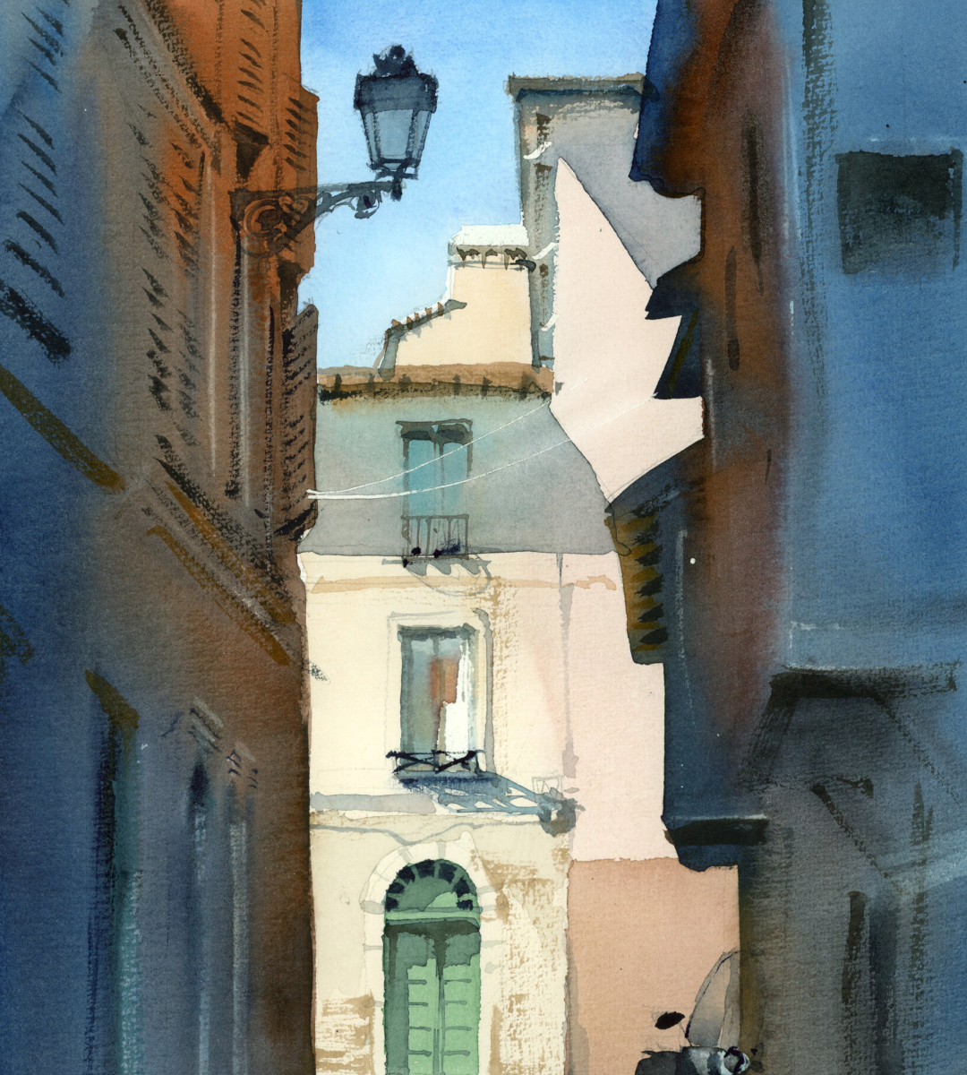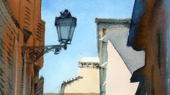Начнём с карандашного рисунка, затем заложим самые светлые акварельные плоскости, постепенно усиливая контрасты и прорабатывая тёмные участки, чтобы собрать цельную атмосферу сцены и глубину пространства.