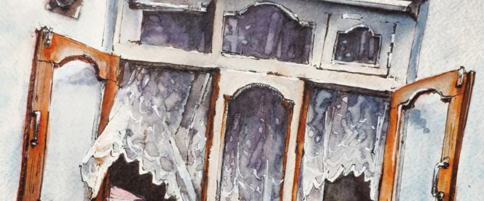 Поработаем с композицией, контрастами тона и цвета, прозрачностью и движением ткани, а также с фактурами стены, деревянной рамы и стекла. Материалы: акварельные маркеры.