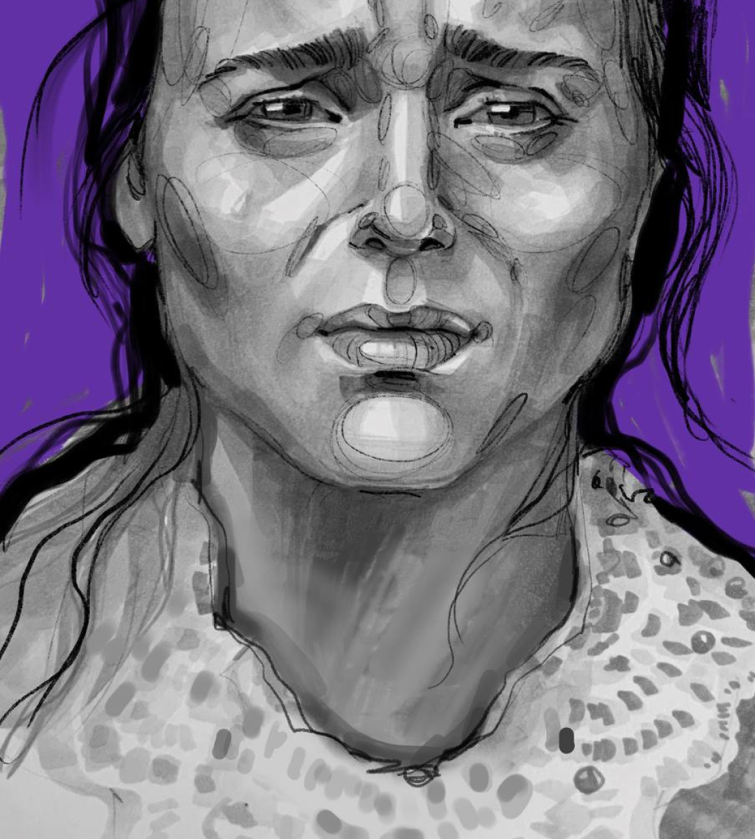Начнём с построения: разберём базовую схему пропорций лица в анфас и найдём индивидуальные особенности модели. Особое внимание уделим мимике — сведённым «домиком» бровям и работе мышц лица, которые формируют выражение и настроение портрета.