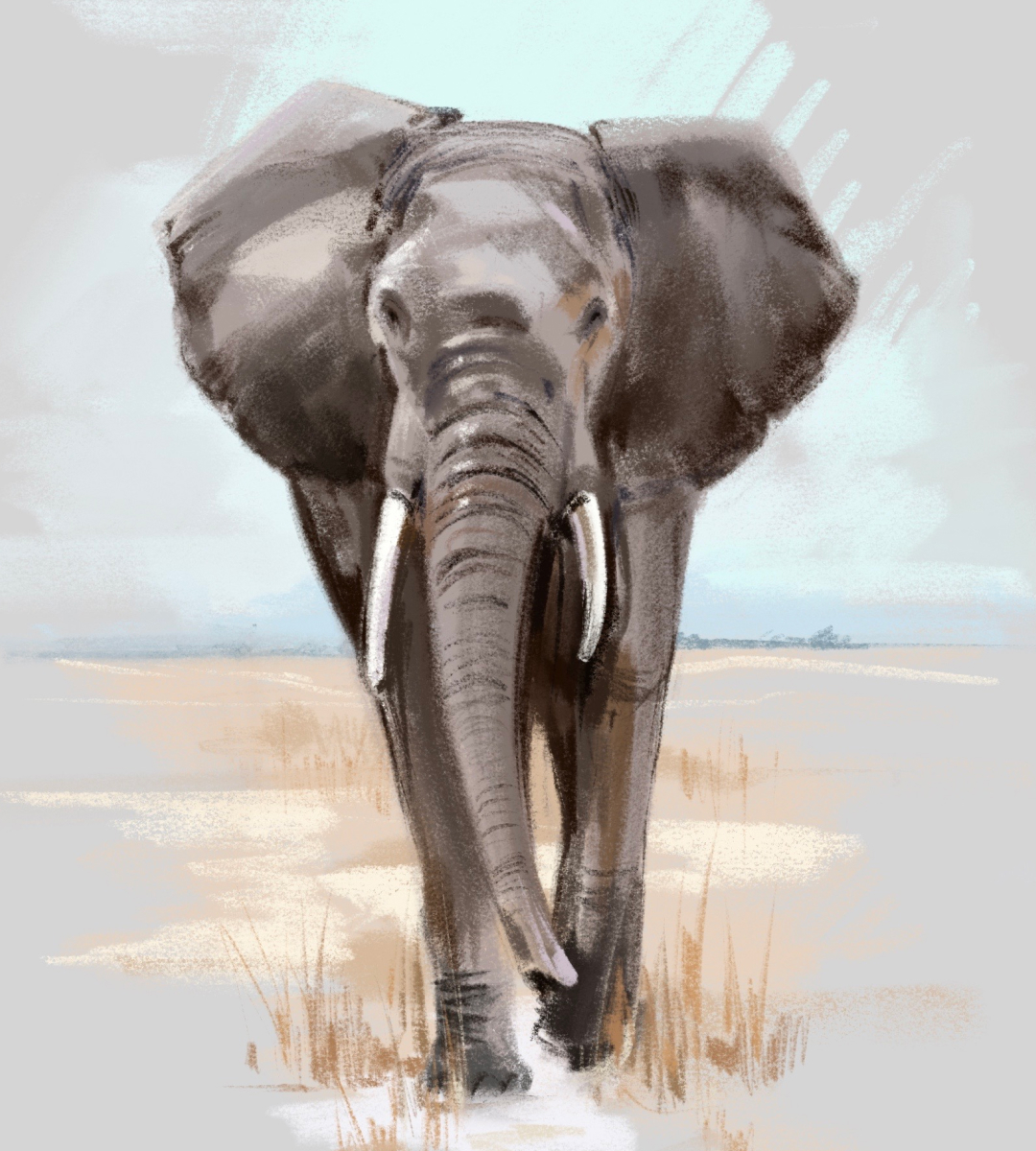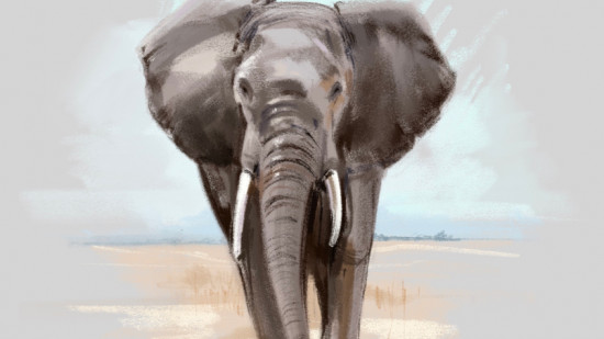 Дальше включаем живопись! Подбираем оттенки для нашей палитры и учимся передавать матовость и шершавость кожи слона. Добавляем детали — ровно столько, чтобы скетч оставался динамичным и лёгким.