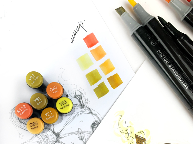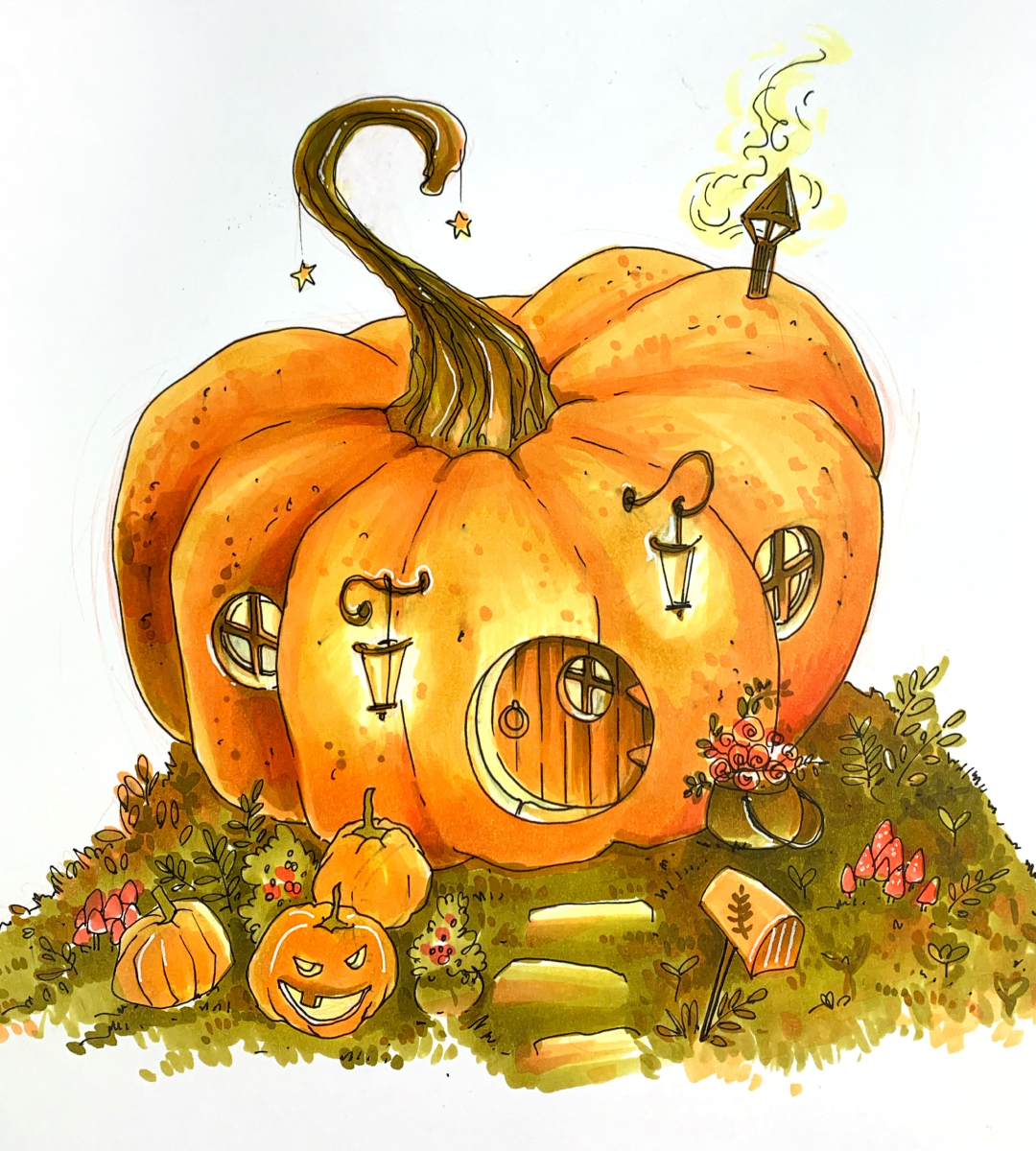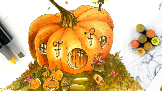 На уроке рисуем осенний сюжет — домик в форме тыквы. Пошагово разбираем, как работать маркерами: