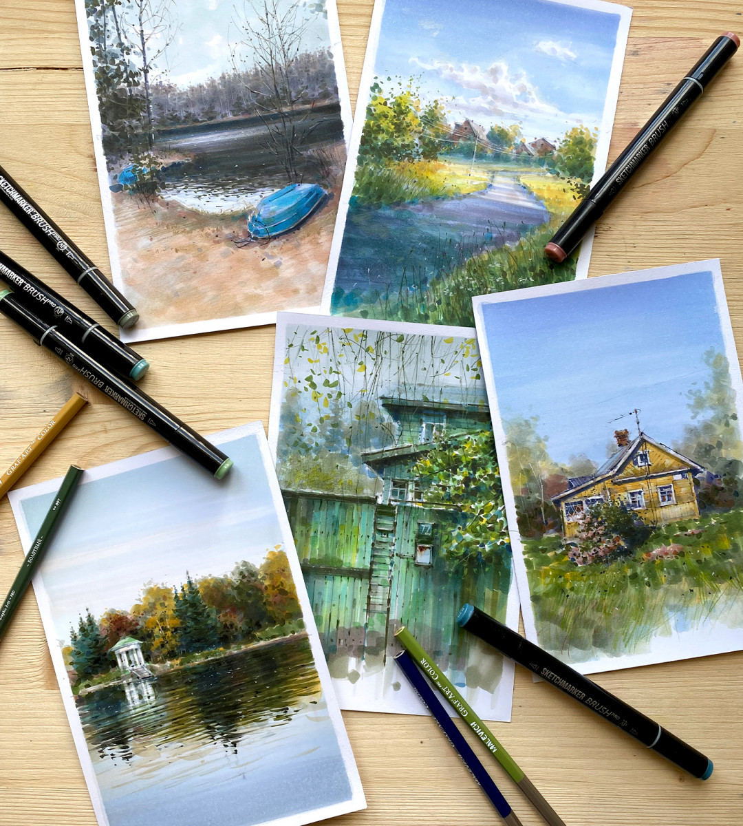 Курс о том, как понимать пейзаж: через планы, тональность, степень детализации, массы зелени. О любви к деталям и фактурам через влажные, почти акварельные мазки макрерами и текстуру цветных карандашей.